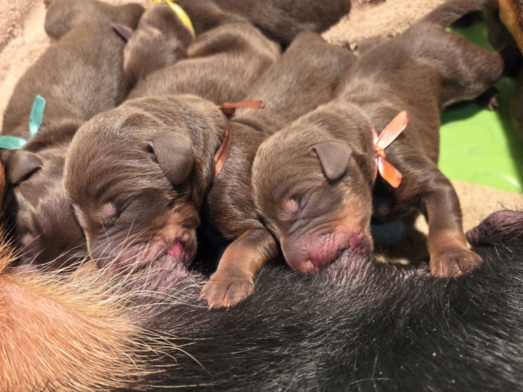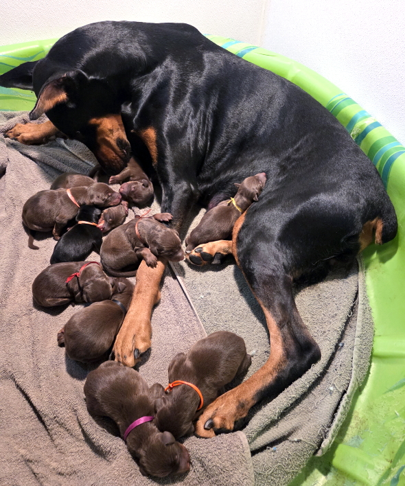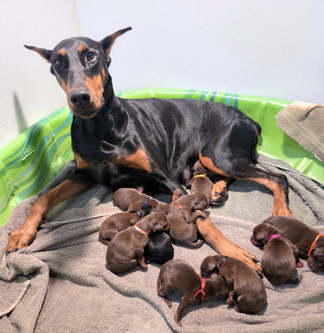 Presenting Our W Litter Puppies Born: April 6, 2026 A combination of North and South American bloodlines with some European lines!! We expect puppies with lovely temperaments. Puppies should be elegant yet powerful with bone and substance and beautiful expressions. They will have high potential for show, obedience or make excellent companions!! We have 3 red males and 1 red female available for reservation!! Puppies will be ready for new homes in early June. Smiley face Harley thought it was pretty funny that her litter was nearly all red except for one solo black!!![]()