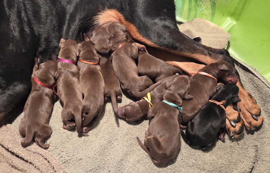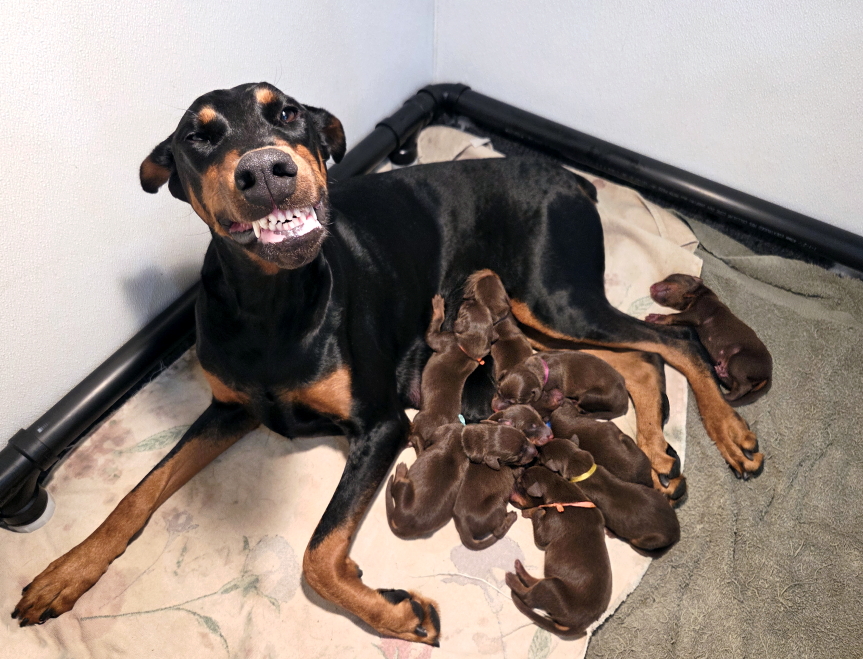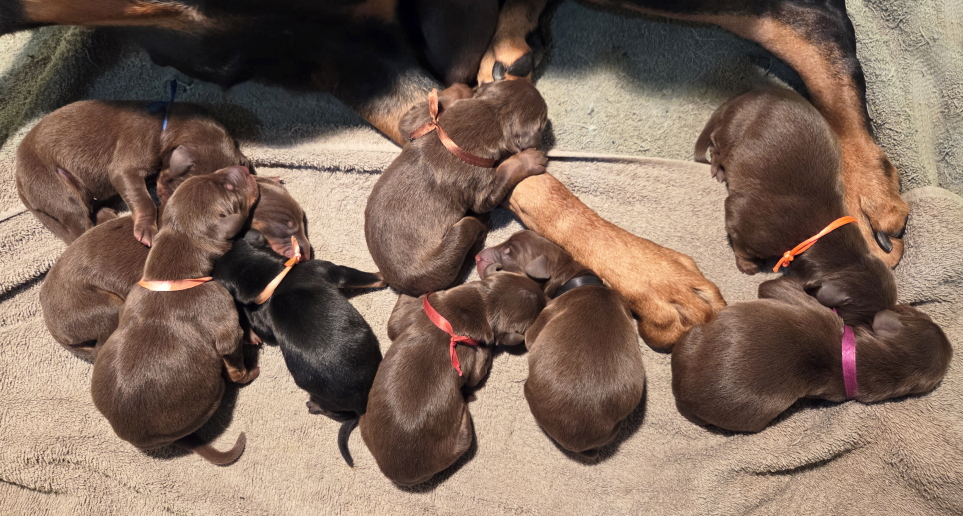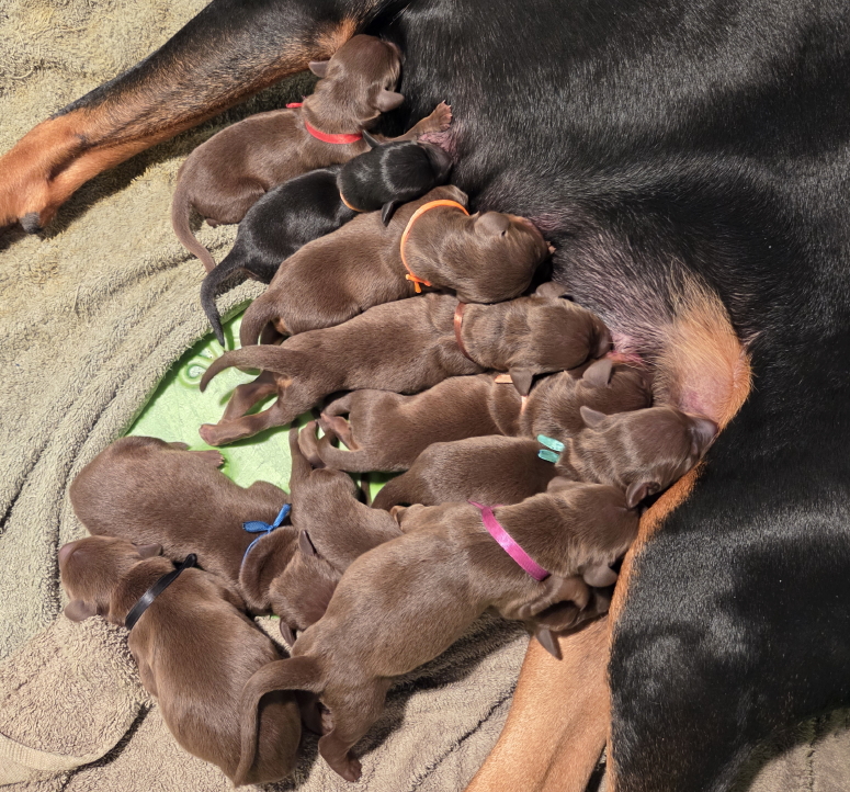Presenting Our W Litter Puppies Born: April 6, 2026 A combination of North and South American bloodlines with some European lines!! We expect puppies with lovely temperaments. Puppies should be elegant yet powerful with bone and substance and beautiful expressions. They will have high potential for show, obedience or make excellent companions!! We have 3 red males and 1 red female available for reservation!! Puppies will be ready for new homes in early June. Smiley face Harley thought it was pretty funny that her litter was nearly all red except for one solo black!!![]()
